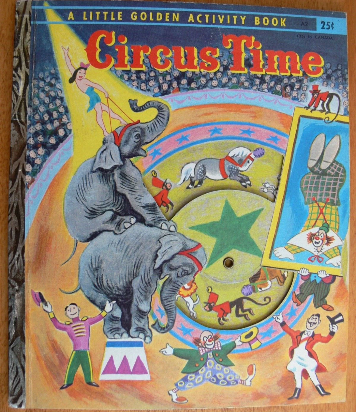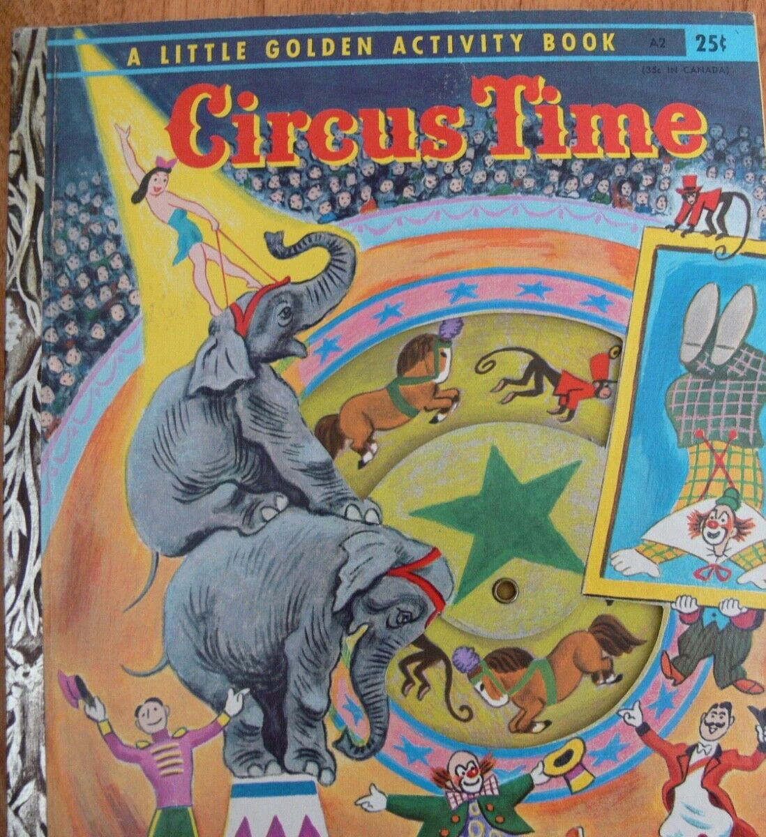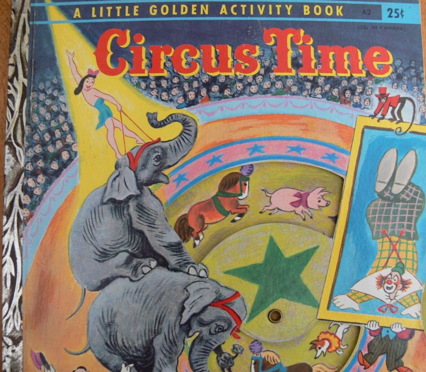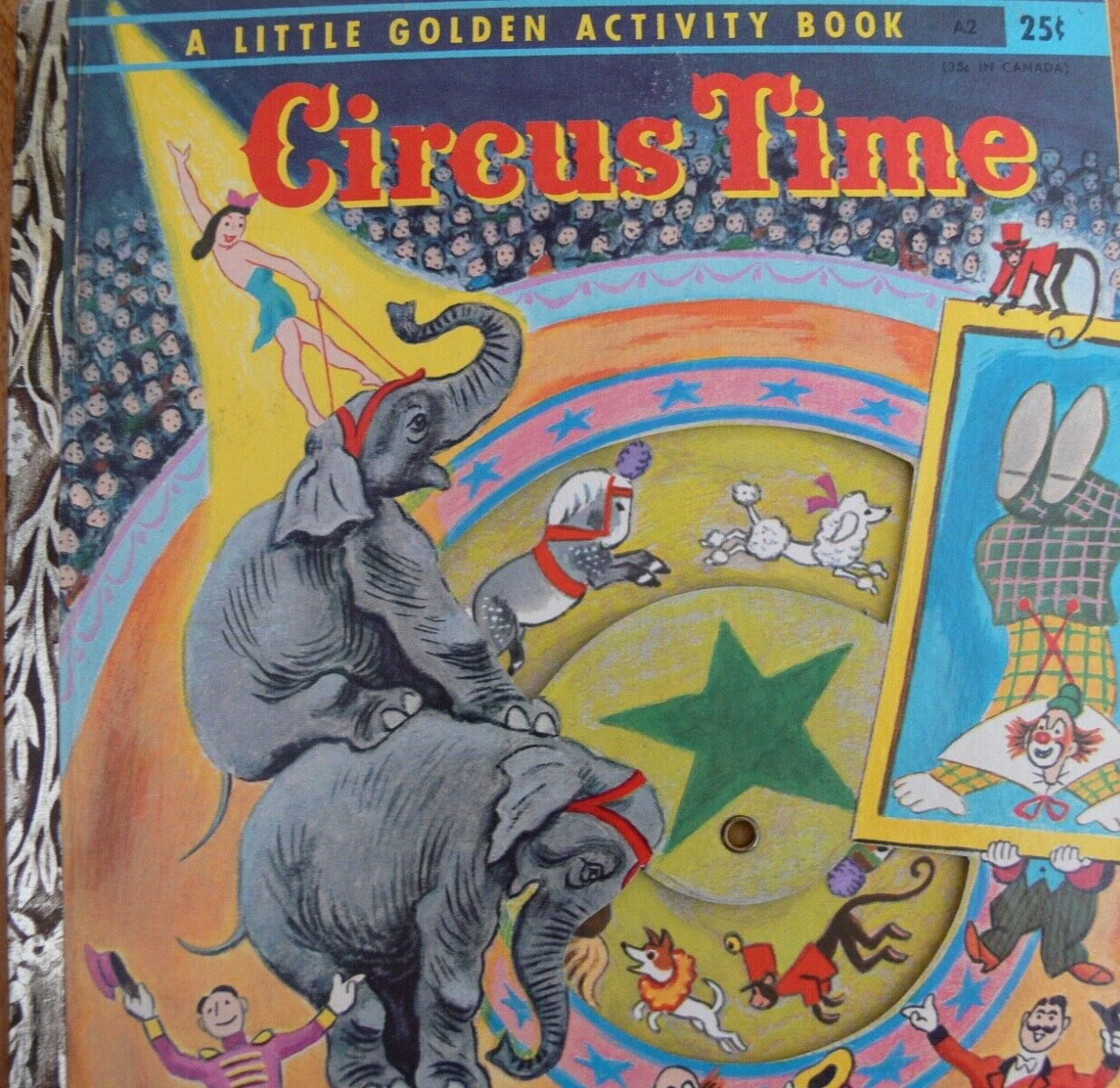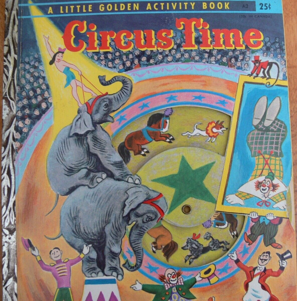 A Little Golden Activity Book #A2 has wheel inside the cover to display different animals performing during the circus. Eample images included along with the story.